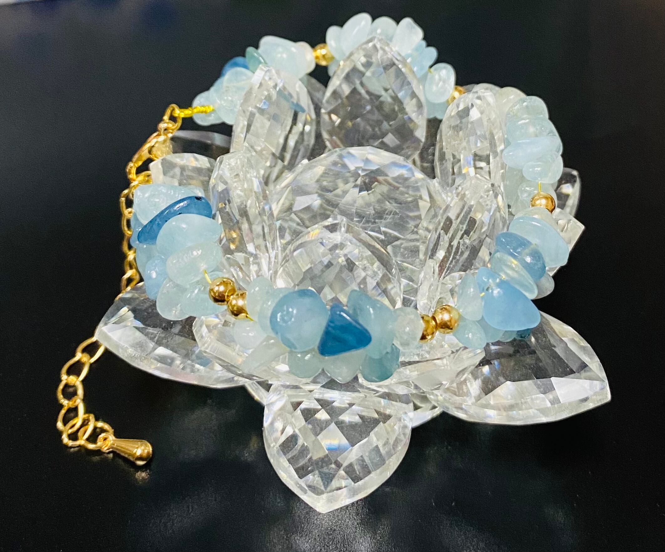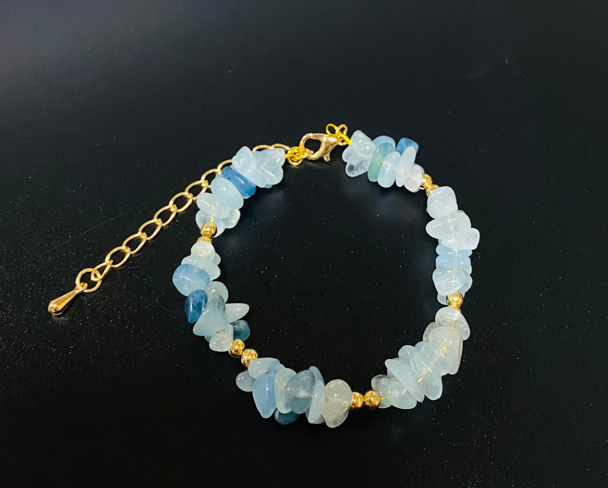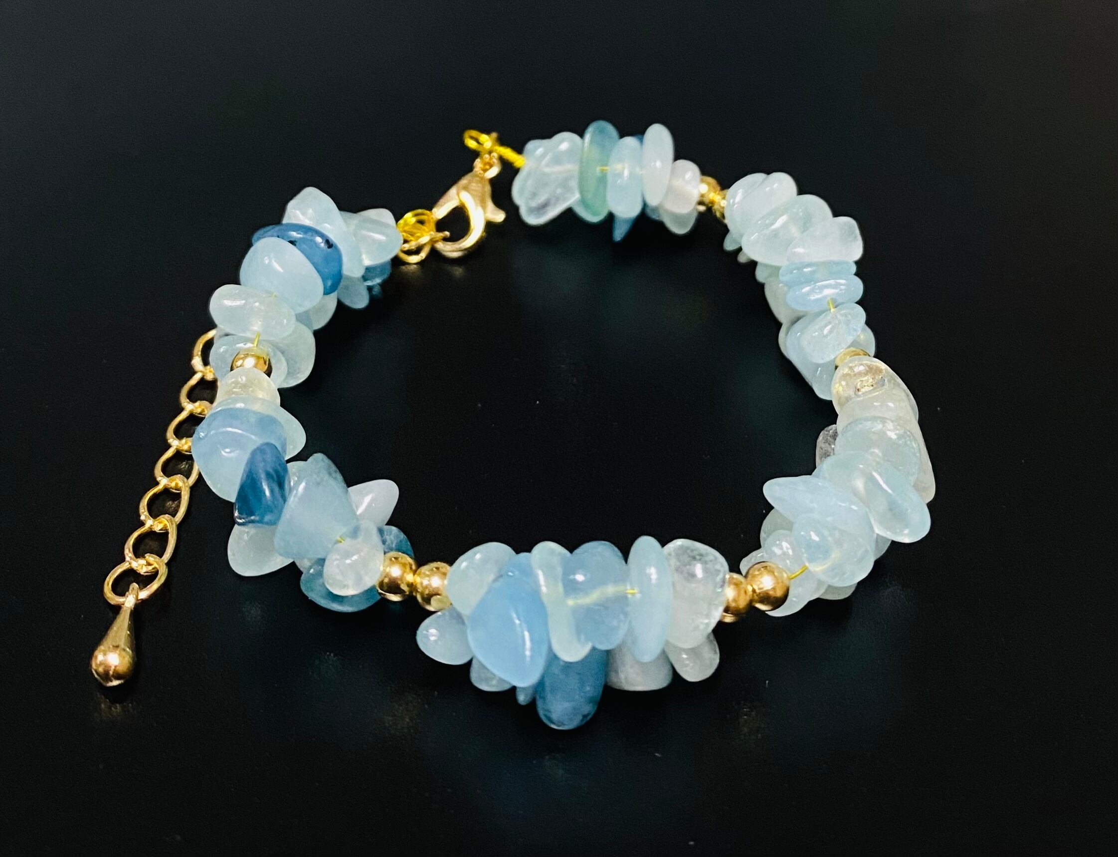 このブレスレットには、古くから「幸福の石」として知られるアクアマリンを使用しています。その美しいブルーは、海のような澄んだ色合いを持ち、不安やストレスを取り去り、純粋で幸福な気持ちをもたらす力があると言われています。また、精神や感情を癒やす効果もあるとされています。